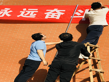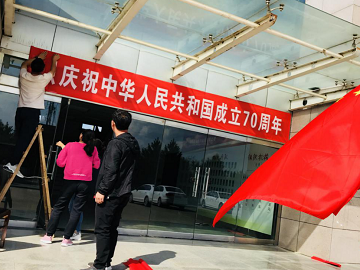 一是在综合楼、氧化沟、维修间等悬挂“热烈庆祝中华人民共和国成立70周年”的标语营造欢乐、祥和、喜庆的节日氛围,迎接国庆节的到来;二是在公司门口显著位置悬挂国旗、办公桌摆放国旗摆台等,在公司积极营造喜气洋洋的节日景象。