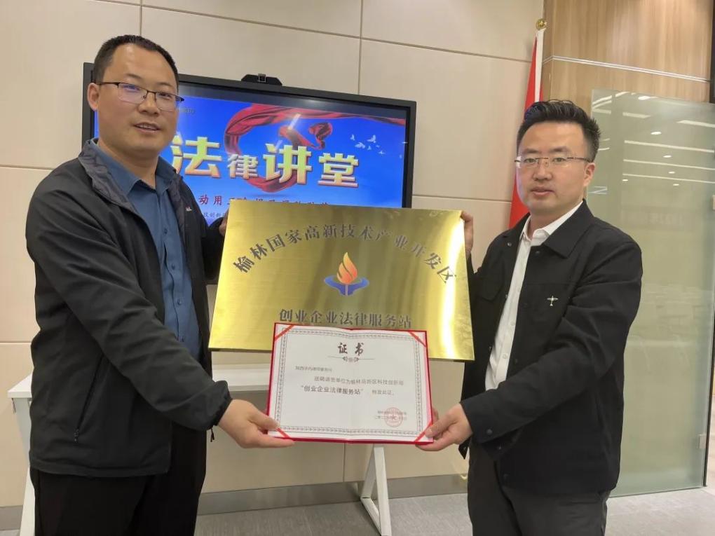 讲座最后,榆林高新区科技创新局向陕西宇内律师事务所颁发“榆林高新区创业企业法律服务站”匾牌。