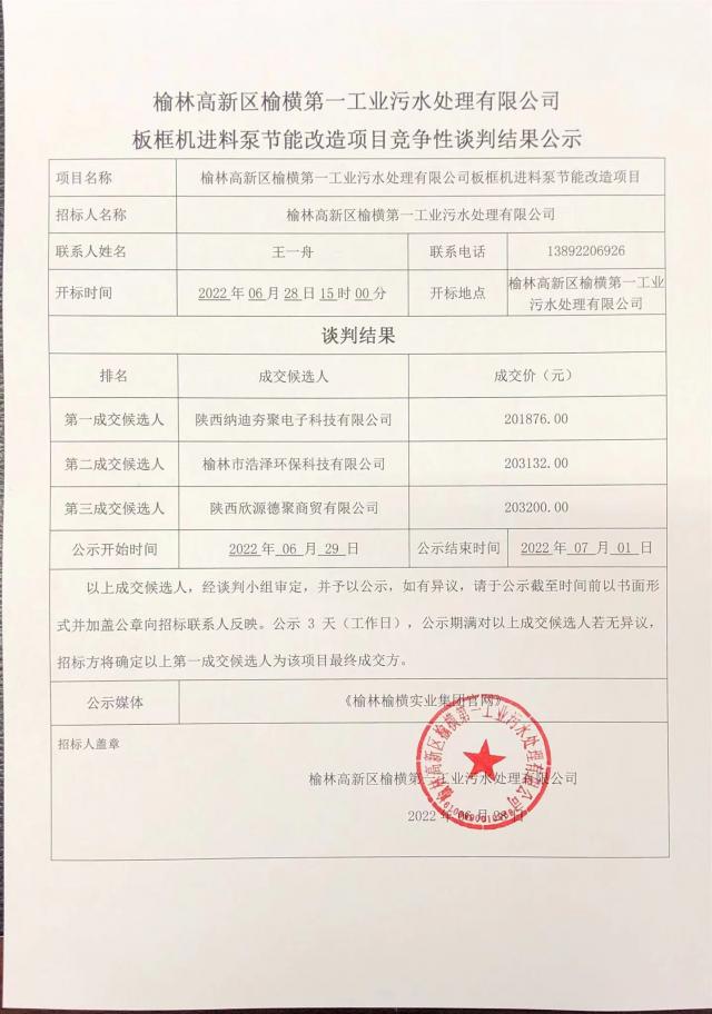 榆林高新区榆横第一工业污水处理有限公司 板框机进料泵节能改造项目竞争性谈判结果公示